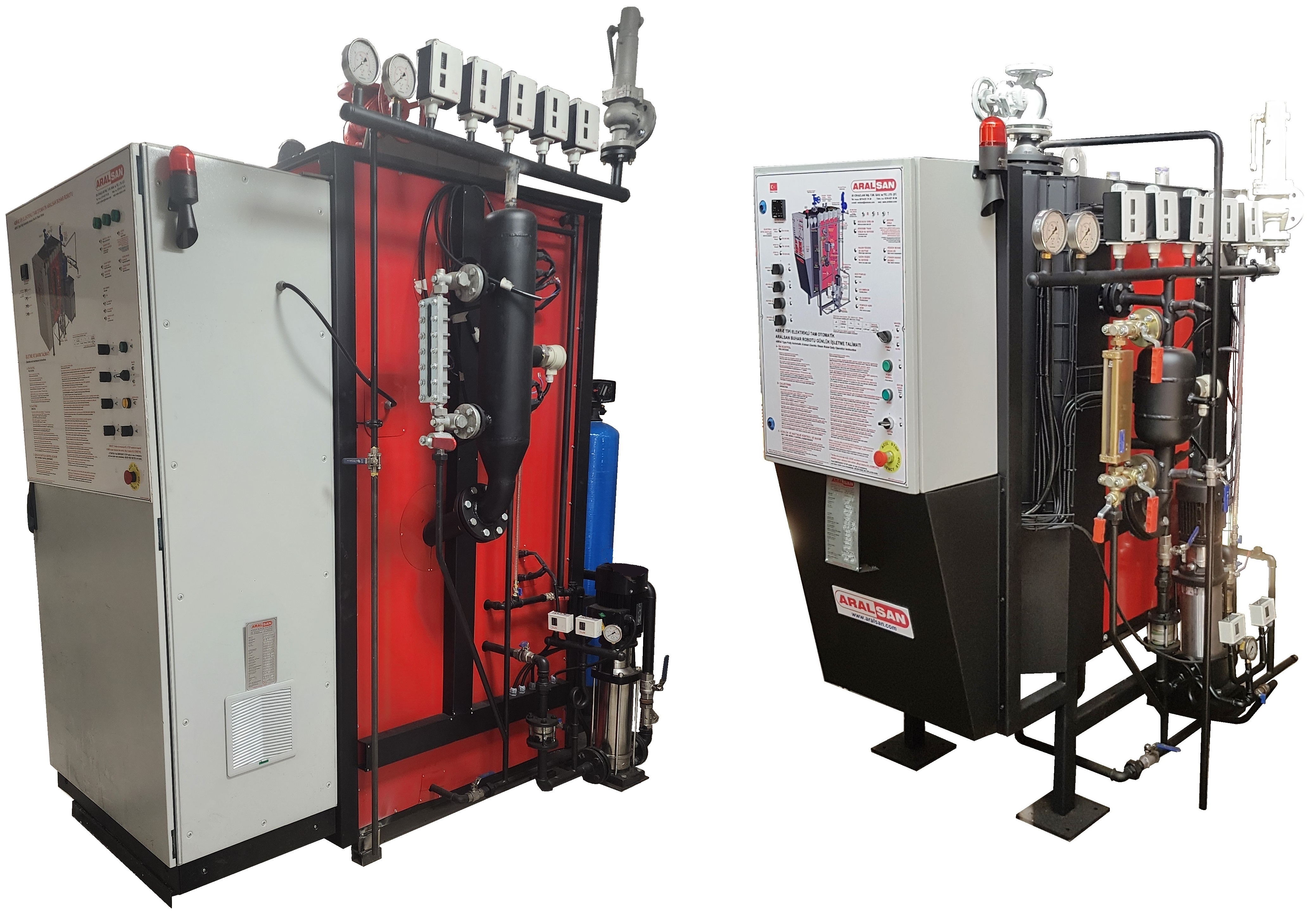 Language EnglishVertical Tabs General Designed for producing steam by using electricity specially where chimney installation difficult is. ALL IN ONE type package steam boiler including its all necessary equipment Ready to use after making of connections (water, steam, electricity) Certified according to 2014/68/EU PED directive and delivered with CE sign User friendly control panel easy operation Capacity Range Manufactured according to customer request at the capacity ranging from 10 kg/h steam to 5000 kg/h steam and at the operation pressure ranging from 0.5 bar to 20 bar. Standard Operation Accessories Boiler body Control panel Nice operation instructiun on anodized aluminum Electric heaters made from AISI 316 seamless stainless steel tubes. Integrated condensate tank Boiler feed pump Pump valves, check-valve, air-went valve, pressure gauge Main steam valve Air-went valve Bottom blowdown valve Surface blowdown valve Water level controller Water level gauge Pressure controller Pressure gauge Condensate tank valves and water level gauge Condensate tank water level controller Standard Safety Accessories Safety valves Safety pressure controller Electrodes for low water level Electrodes for high water level Electrodes for low water level in condensate tank Steam temperature controller Pump subpressure controller Pump super pressure controller Overload protection system for pump motor Phase protection relay Alarm light and buzzer Optional Accessories Modulating load control with thrystor system Modulating water feeding system Automatic bottom blowdown Automatic surface blowdown Steam flowmeter Steam flow rate adjusment system Water softener Feed water dosage pump Integrated deaerator Hot water exchanger Steam head Steam seperator Flue gas duct and chimney PLC control panel Remote monitoring and remote control Operation features Full automatic working Automatic heater control according to steam pressure Safety operation Automatic control of each boiler parameter seperatly High efficiency Environment friendly operation No flue gas emmission Manufacturing features Manufactured with high quality certified boiler sheet in accordance with EN 12953 High quality welded or seamless boiler tubes certified according to pressure group Vertical placement of electric heaters made from AISI 316 stainless steel All weldings are made by welders certified in accordance with EN 9606-1 All weldings are controlled by NDT technicians and UT test is applied to a certain percentage of them Whole body is painted double coat with heat resistant paint Insulated with rock wool and covered color galvanized sheet Handhole on it offers easy cleaning of water side Mounted on power pedestal ARALSAN's warranty extendable up to 5 years Katalog aralsan_abr-e.pdf Weight: -20
