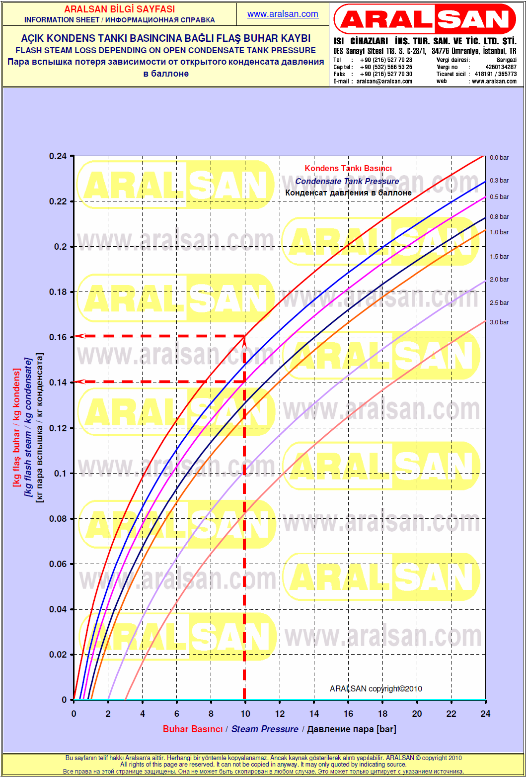 Değişik işletme basınçlarında oluşan flaş buhar kayıp oranları aşağıdaki grafikte gösterilmiştir. Kondens miktarı ile, grafikten alınacak oran çarpıldığında flaş buhar kayıp miktarı bulunur. Bu grafikte en üstteki kırmızı eğri, kondens basıncının atmosfer basıncına kadar düşmesi sonucu flaş buhar kayıp oranını göstermektedir. Diğer eğriler ise, kondens tankında veya flaş buhar tankında üst basınç oluşması durumundaki flaş buhar kayıp oranlarıdır.